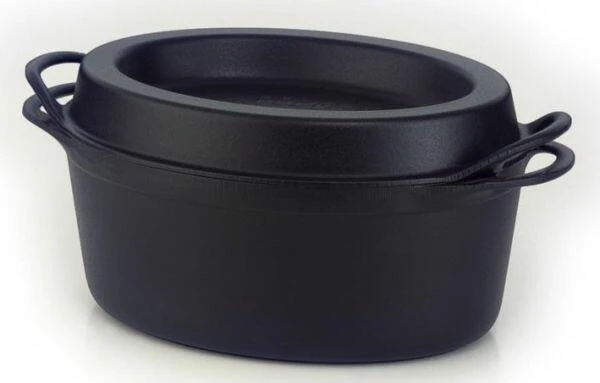 Le Creuset Saftbräter Doufeu oval aus Gusseisen in schwarz. Der le Creuset Doufeu ist ein spezieller Schmortopf für saftiges Fleisch, vollen Geschmack und besonders schonende Zubereitung. Der Name des Bräters ist Programm: „feu doux“ bedeutet im Französischen sanftes Feuern oder kleine Hitze. Der Schmortopf arbeitet nicht mit viel Power sondern auf die sensible Art.