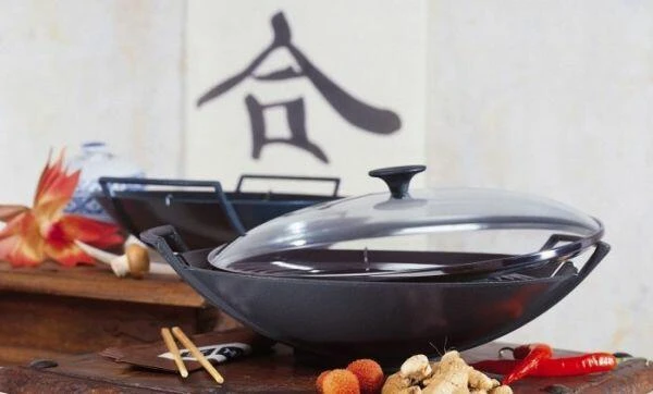 - Ausstattung: Wok mit Glasdeckel aus Gusseisen
