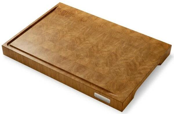 Das Hack- und Schneidbrett der Marke Nesmuk überzeugt durch seine einzigartige Qualität, seine ästhetische Optik und zeitlos schöne Form. Er ist mit größter Sorgfalt aus bester süddeutscher Eiche gefertigt. Das Brett ist aus Stirnholz gefertigt, das besonders schonend für die wertvollen Messerklingen ist und die feine Oberfläche langlebiger erhält. Das Eichenholz ist durch seinen hohen Gerbsäuregehalt von Natur aus antibakteriell und entspricht hohen hygienischen Anforderungen. Die leicht strukturierten Eichenleisten werden von Hand verlesen und präzise zusammengefügt. So entsteht ein charakteristisches, symmetrisches Muster, welches durch die schlichte Form noch verstärkt wird. Ein sehr feiner Oberflächenschliff und eine abschließende Behandlung mit Leinöl sorgen für eine edle und glänzende Anmutung. Somit handelt es sich bei jedem Hack- und Schneidbrett um ein Unikat, welches sich perfekt für jede Brotzeit und ideal zum Schneiden von Gemüse und Fleisch eignet. Das Hack- und Schneidbrett ist mit Griffmulden und einer großzügig bemessenen Saftrinne versehen. Es ist nicht spülmaschinengeeignet und sollte von Hand gereinigt werden. Um die kräftige Farbe des Holzes zu erhalten, empfiehlt es sich die Oberfläche hin und wieder mit säurefreiem Öl einzureiben z.B. mit dem Nesmus Pflegewachsöl.