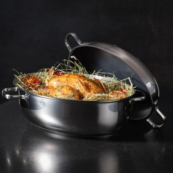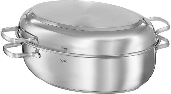 Der große, ovale Bräter von Rösle aus Edelstahl verfügt über einen gekapselten Boden mit Aluminiumkern, wodurch eine gleichmäßige Wärmeverteilung und -speicherung garantiert wird. Zwei versetzt angeordnete ergonomisch geformte Griffe sichern eine komfortable Handhabung. Außerdem ist der Edelstahlbräter, der von außen hochglanzpoliert ist, mit einem Multifunktionsdeckel ausgestattet, der mit einer schwarzen DuPont Antihaftversiegelung aus PTFE versehen ist. So wird verhindert, dass das Bratgut beim Braten anhaftet. Mitunter deswegen lässt sich der Bräterdeckel auch einzeln optimal als Pfanne nutzen, in der beispielsweise Fischgerichte zubereitet werden können. Temperaturbeständig sind Bräter und Deckel bis 260 °C. Aufgrund der verwendeten Materialien kann auch eine Reinigung in der Spülmaschine vorgenommen werden.