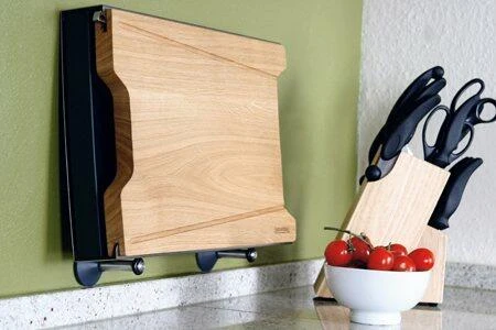 - Tipp: Unsere praktische Wandhalterung sorgt für Ordnung. Ein zusätzliches Kunststoffbrett aus spülmaschinentauglichem PE 500 Kunststoff kann hilfreich sein, da die Holzbretter nicht spülmaschinentauglich sind.
