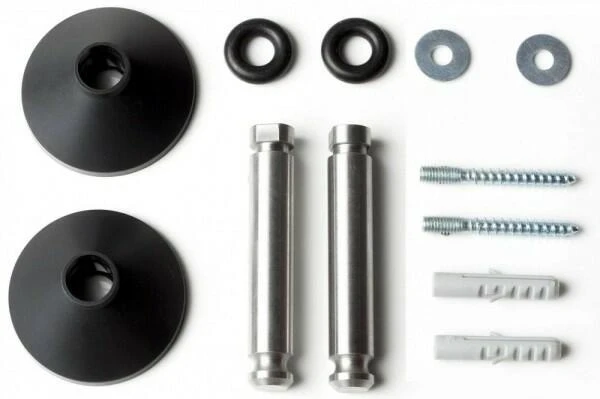 Die Wandhalterung wird mittels zwei Edelstahlbolzen, Schutz O-Ringen für die Bolzen sowie 2 ABS Kunststoffkappen für die Schrägstellung der Schneidbox montiert. So kann die Schneidbox für den nächsten Kücheneinsatz praktisch aufbewahrt werden.