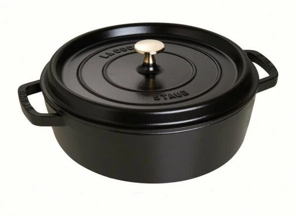 Eigenschaften des Staub Cocotte rund und flach aus Gusseisen in schwarz: