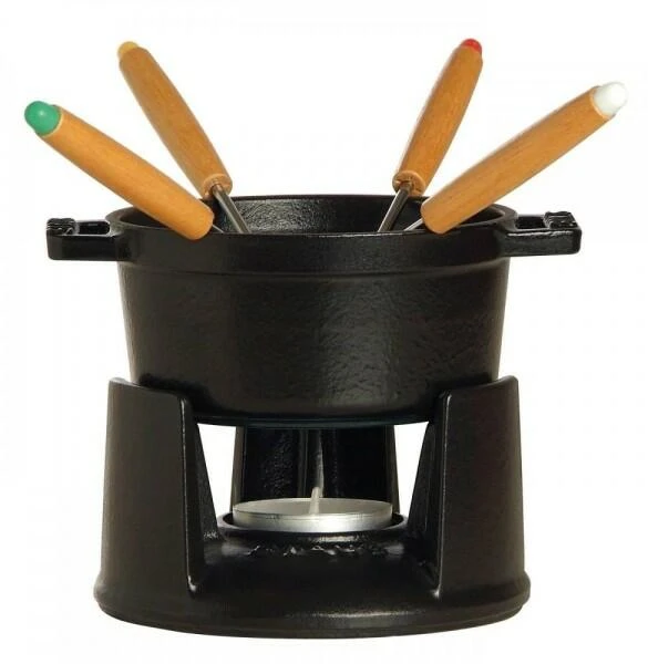 Staub. Denn neben den funktionalen Vorteilen, den die Töpfe aufweisen, zeigen sie auch besonderen Stil. Durch die hervorragende Leitfähigkeit von Gusseisen verteilt sich die Wärme schnell und gleichmässig im Topf. Dies bedeutet, dass auch auf dem Rechaud der Topf überall gleichmässig heiß ist und nicht nur punktuell am Boden. Dazu kommt als weiterer Vorteil die hohe Wärmespeicherfähigkeit des Materials. So muss die Flamme unter dem Topf nicht immer die volle Leistung bieten, um die Schokolade auf Temperatur zu halten. Das Gusseisen sorgt also für ein ausgesprochen lang anhaltendes Fonduevergnügen. Natürlich ist es auch bei diesen Töpfen vorteilhaft, die Schokolade auf dem Herd zu erhitzen und sie dann aufs Rechaud zu stellen.